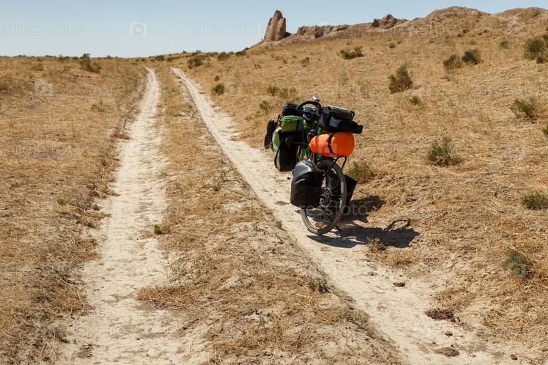 Туристический велосипед с сумками стоит на пыльной дороге возле руин древнего города Сауран или Сауран в Казахстане