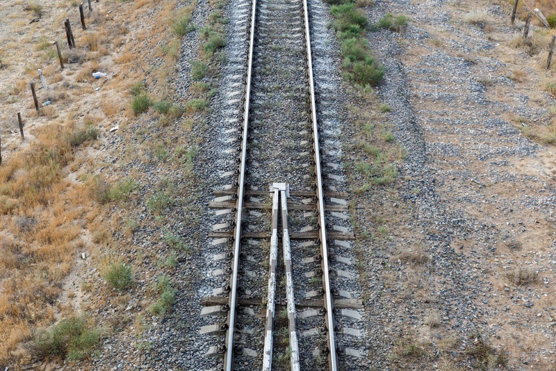 Железная дорога в степи Казахстана, вид на рельсы с моста
