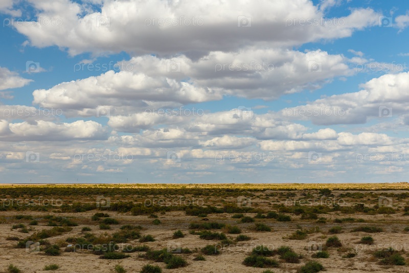 Степь в Казахстане, красивый пейзаж, зеленая трава и облачное небо