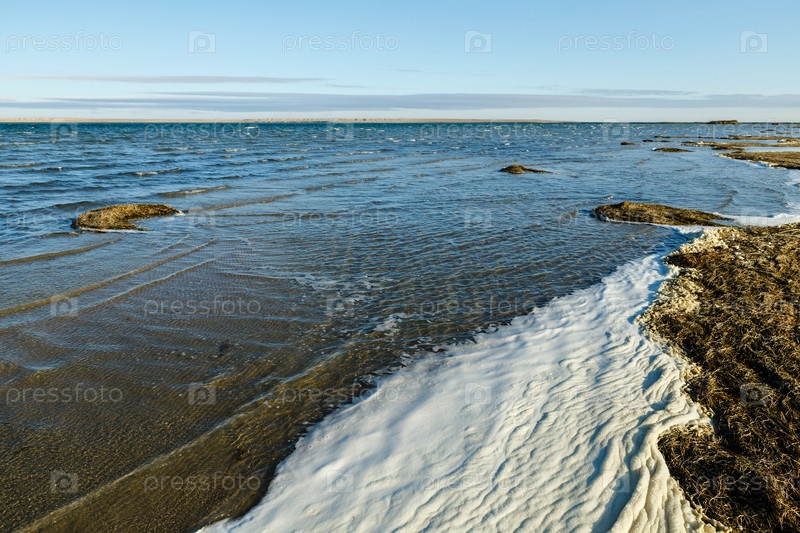 Озеро Камыслыбас или Камышлыбаш, большое соленое озеро в Кызылординской области, Казахстан. пена и водоросли на берегу