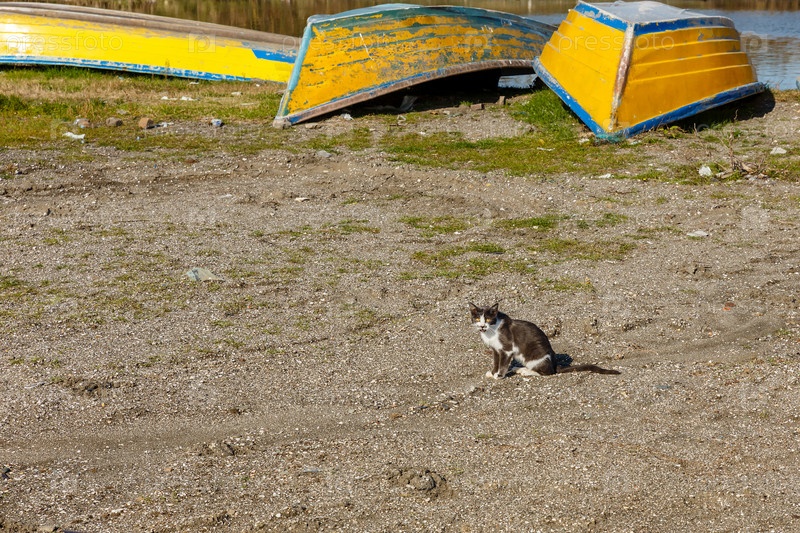 Бездомный кот сидит на берегу в порту рядом с желтыми рыбацкими лодками