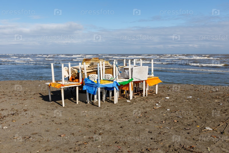 Пластиковые столы и стулья, сложенные на песчаном берегу перед штормом, защита от шторма
