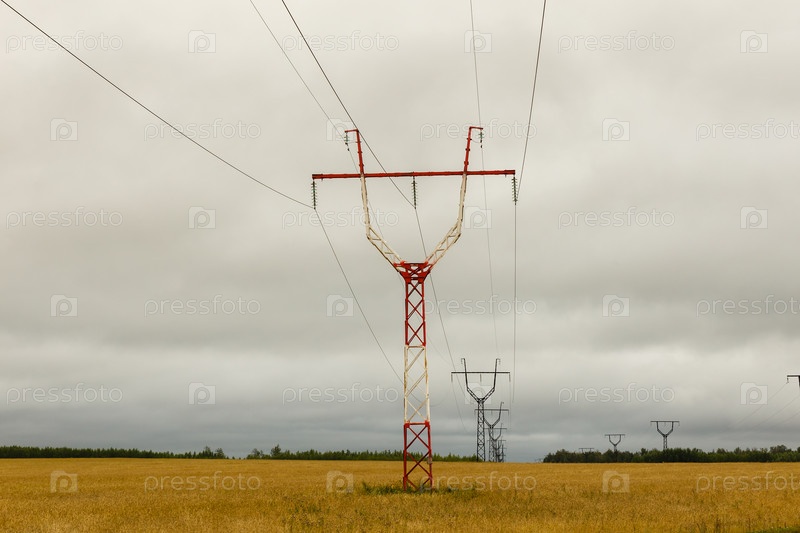 Опора ЛЭП высокого напряжения, опора окрашена в красно-белый цвет