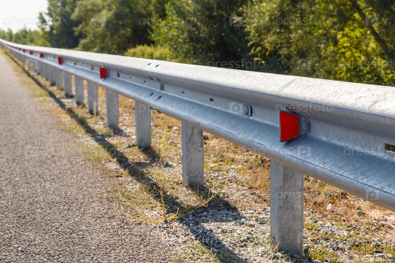 Красные дорожные отражатели вдоль дороги. металлическое дорожное ограждение барьерного типа, крупный план. Дорога и безопасность дорожного движения