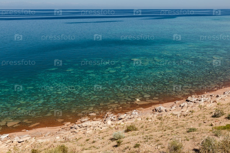 Чистая вода в озере Иссык-Куль в Кыргызстане, камни под водой на дне