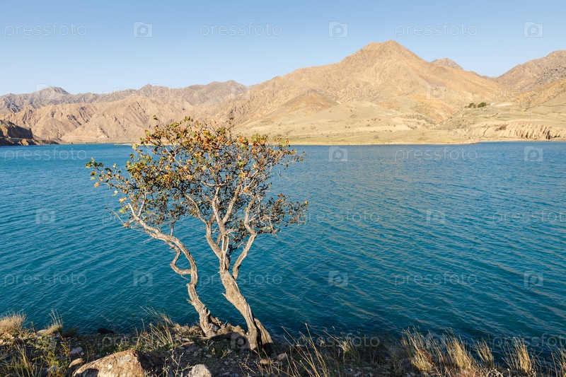 Одинокое дерево на берегу реки Нарын, река Нарын в горах Тянь-Шаня, Кыргызстан