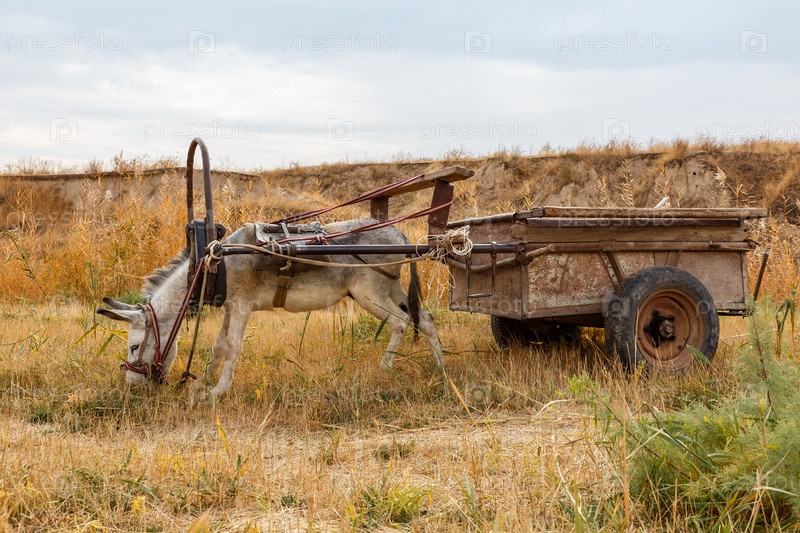 Осел, запряженный в железную телегу, стоит на берегу реки и ест траву. Река Келес, Казахстан