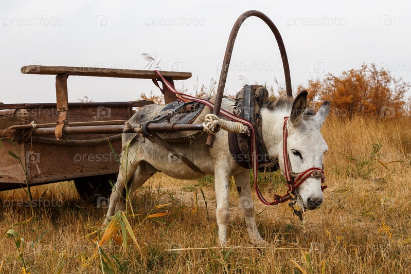 Осел, запряженный в железную телегу, стоит на лугу и ест траву