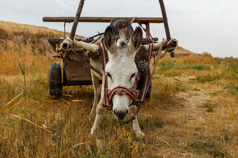 Осел с телегой в поле, осел смотрит в камеру