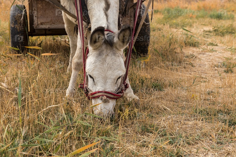 Осел ест траву на пастбище, ослиная голова