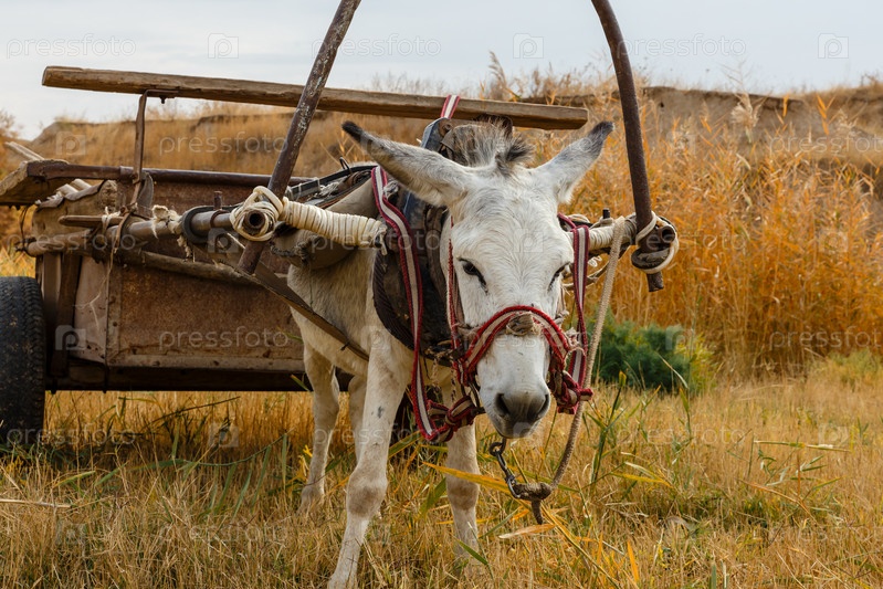 Осел с телегой в поле