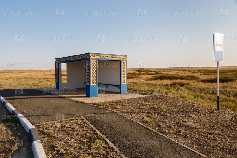 Пустая автобусная остановка на дороге, место ожидания автобуса, Казахстан