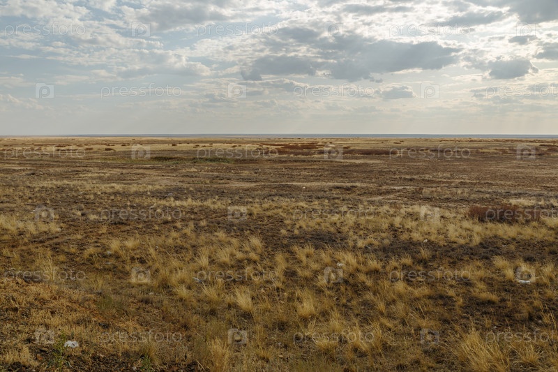 Степь в Казахстане, сухая трава в пустой степи, облачное небо
