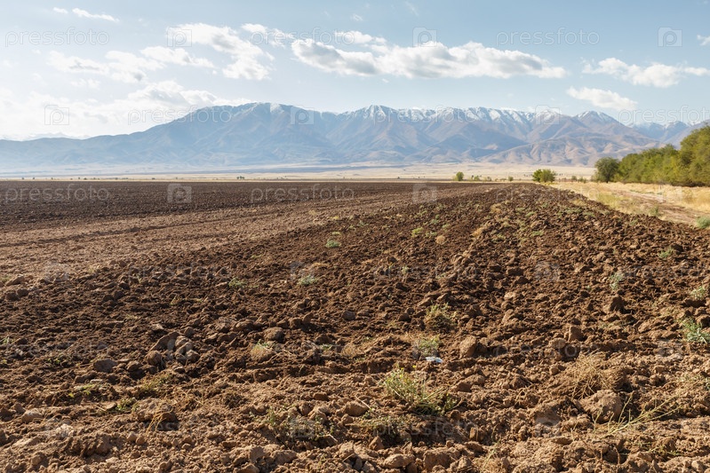Вспаханное поле на фоне гор в Казахстане. Сельскохозяйственный ландшафт