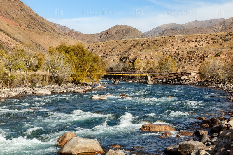 Река Кокемерен, Джумгал Кыргызстан, сломанный мост на реке, красивый пейзаж