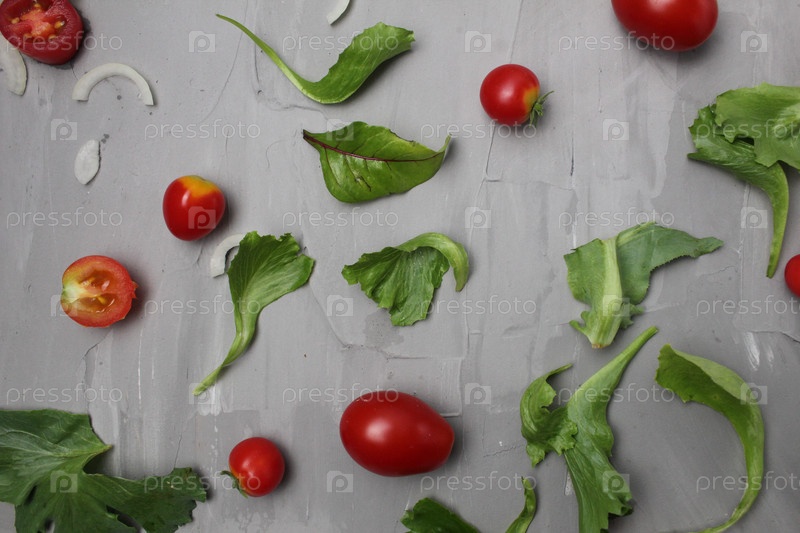 Фон из томатных овощей на сером фоне. Лук салат помидоры на сером фоне. Диета