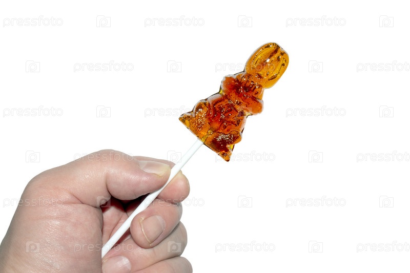Молодёжь на палочке в виде зайца на белом фоне.Молодильник на палочке из жареного сахара.Лолипоп на палке в форме кролика на белом фоне.Lollipop on a stick of burnt sugar