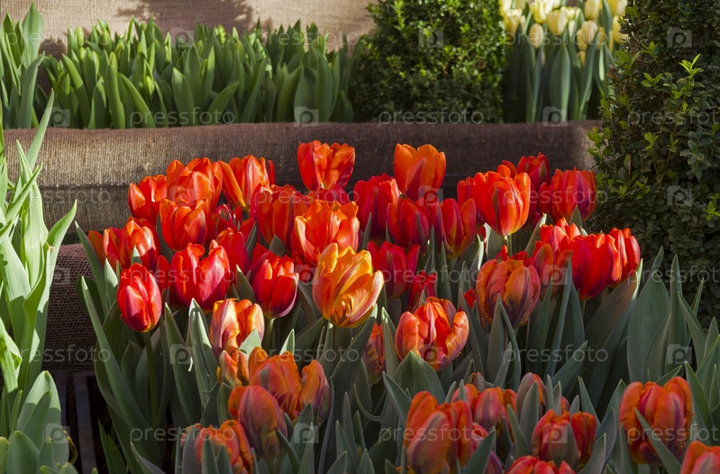 Яркие красные тюльпаны. Традиционная ежегодная выставка "Репетиция весны" в в Аптекарском Огороде (филиал ботанического сада МГУ). Москва