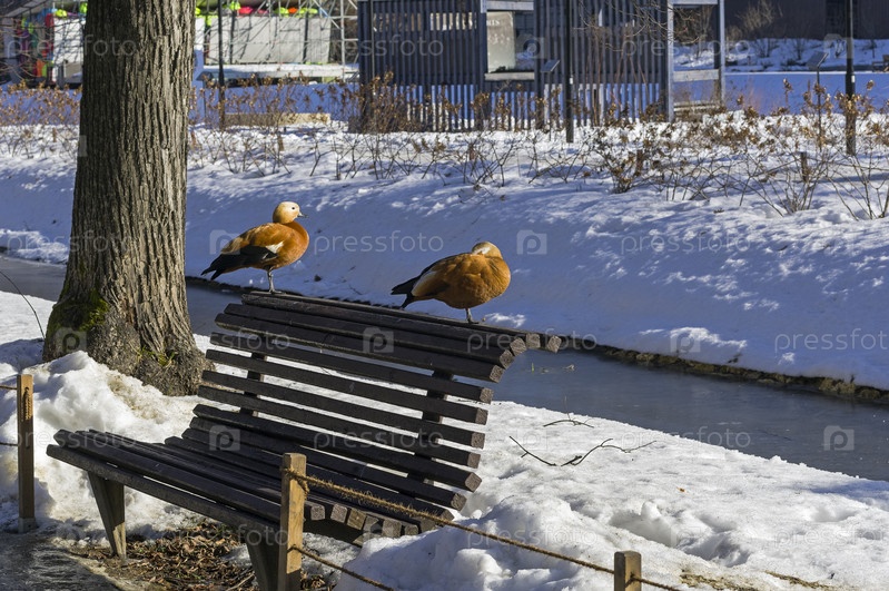 Две утки-огаря на скамейке в зимнем парке. Солнечный день в начале марта. Аптекарский Огород (филиал ботанического сада МГУ). Москва