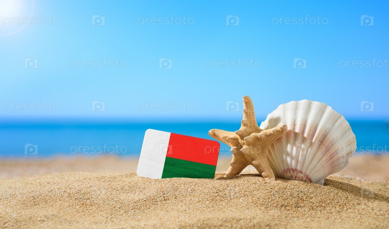 Тропический пляж с ракушками и флагом Мадагаскара. Концепция райского отдыха на пляжах Мадагаскара