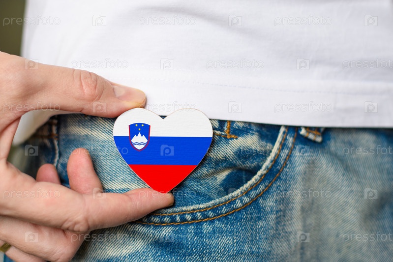 Патриот Словении! Деревянный значок с флагом Словении в форме сердца в мужской руке