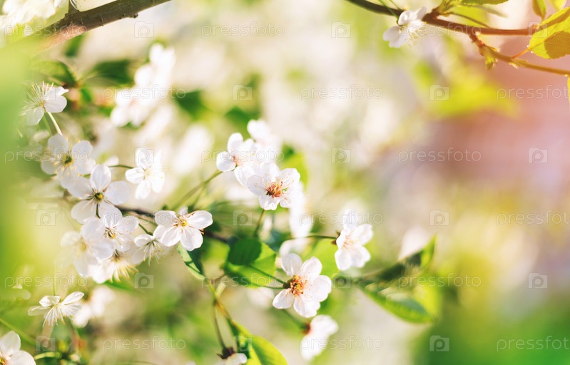 Весенний фон с цветущей ветвью вишневого дерева в солнечный день