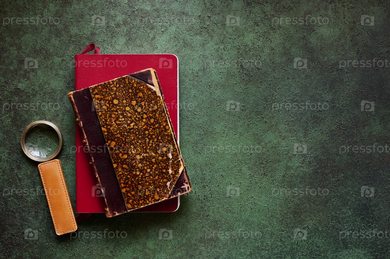 Увеличительное стекло с кожаной ручкой и старые книги на текстурированном зеленом фоне, вид сверху