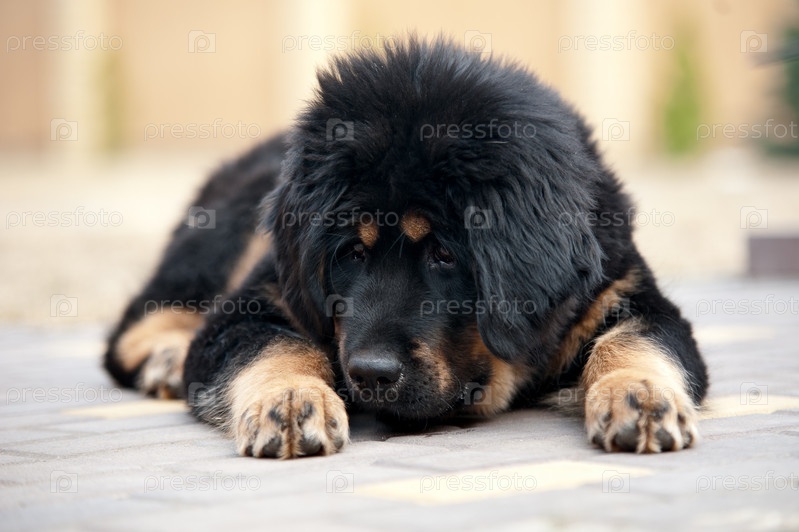 Черный щенок породы мастиф лежит на земле