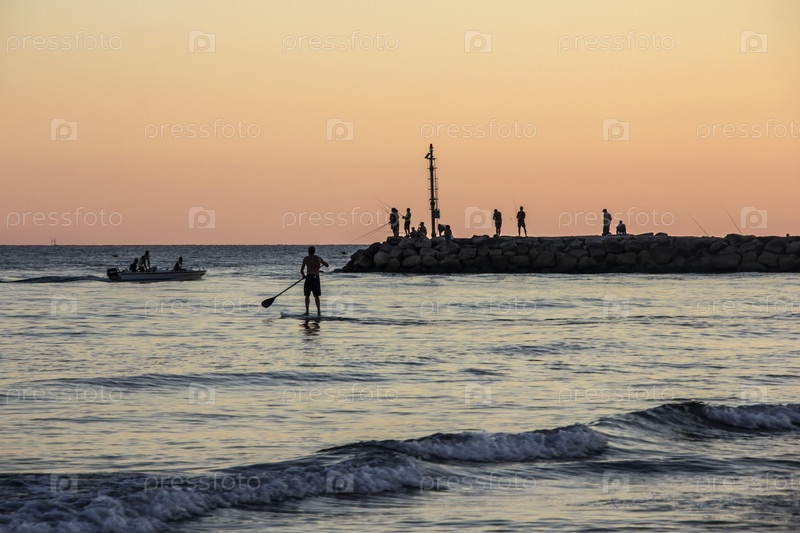 Закат на Тирренском море, вид на волнолом, силуэты рыбаков, гавань и побережье Террачины, Лацио, Италия