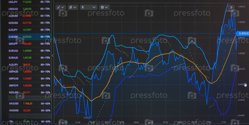 Гистограмма с индикаторами в онлайн-приложении для торговли на бирже или бирже криптовалют, не выходя из дома с актуальной информацией. Концепция заработка в Интернете