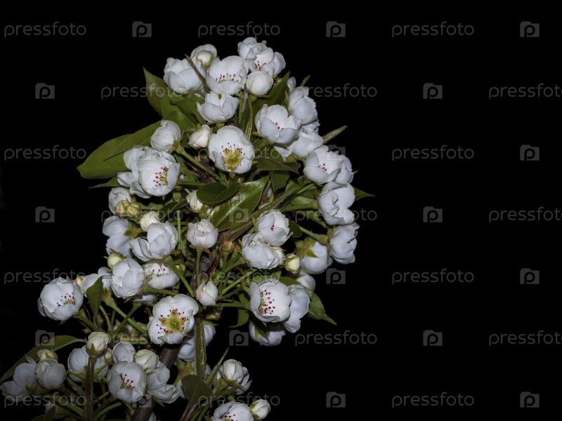Белая веточка цветущей груши на черном фоне. Баннер или праздничный сертификат, место для копирования, место для текста. Цветущая ветвь фруктового дерева ночью. Весеннее время