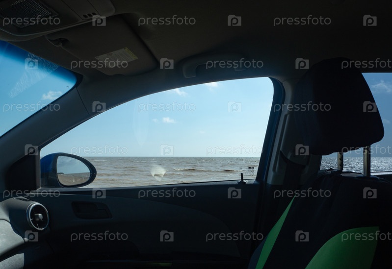 Вид из окна машины на море и голубое небо с белыми облаками. Семья наслаждается морской красотой, сидя в машине во время поездки вдоль побережья