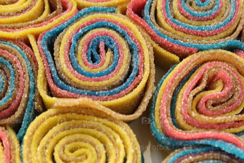 Жевательный листовой мармелад в полосках разноцветных желтых синих красных зеленых, свернутых в улиток крупным планом. День сладостей, полезные угощения. Десерт с агаровым желатином. низкокалорийные десерты