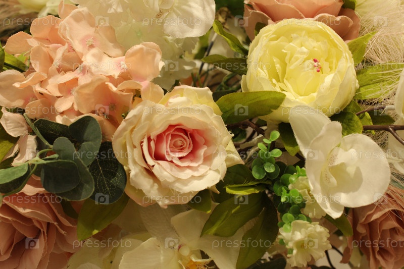 Цветочный светлый фон из белых розовых сосен с светлой зеленью