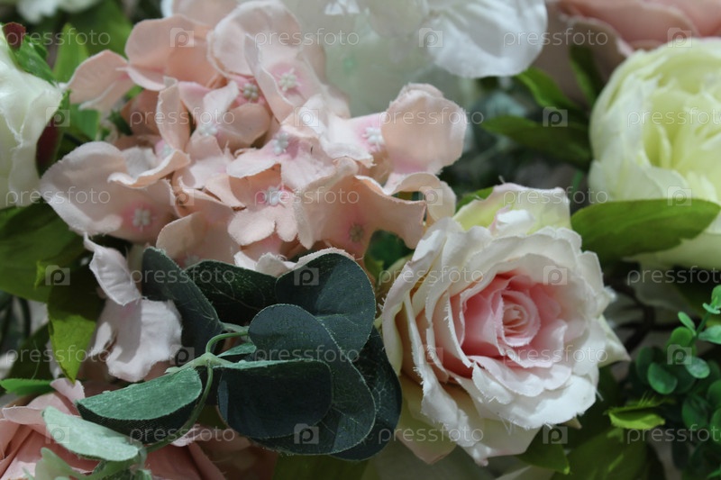 Цветочный светлый фон из белых розовых сосен с светлой зеленью