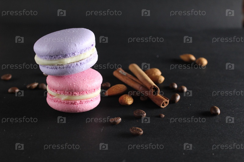 Миндальное печенье и палочки коричного миндаля лежат рядом с черным фоном с местом для текста и с копирайтом