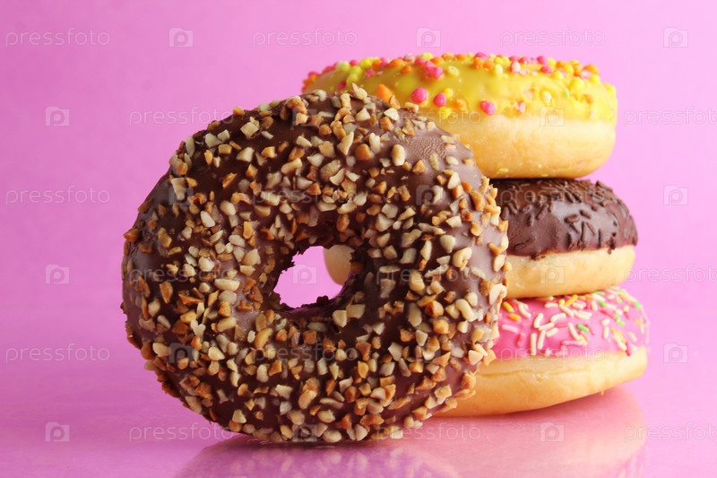 Сладкий натюрмортный пончик берлинер крупным планом сзади лежит стопка из трех пончиков шоколадно-розово-желтого цвета на ярко-розовом фоне цветов фуксии с местом для текста и cpixpe для кафе для постельных принадлежностей для клея
