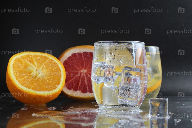 Приготовление лимонадной воды в стакане льда и фруктового апельсинового грейпфрута на черном фоне. Летние напитки. Лимонадный напиток