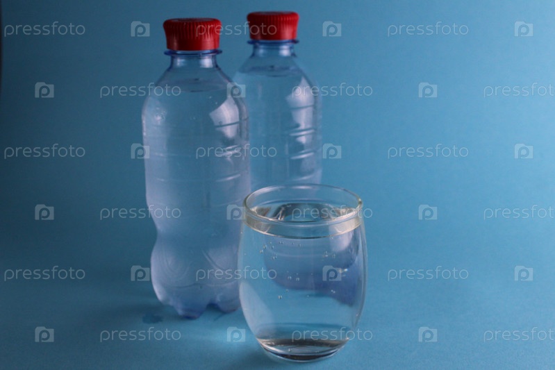 Вода в стакане и рядом есть бутылки с водой на синем фоне. Прохладительные прохладительные напитки летом в жару. Чистая питьевая вода. Баланс воды. Норма потребления воды в сутки