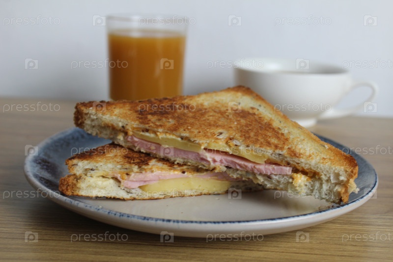 Еда, автрак. Бутерброды с ветчиной, сыром и овощным элениумом лежат на серой тарелке рядом с соком апельсинового абрикоса на столе. Приготовление завтрака