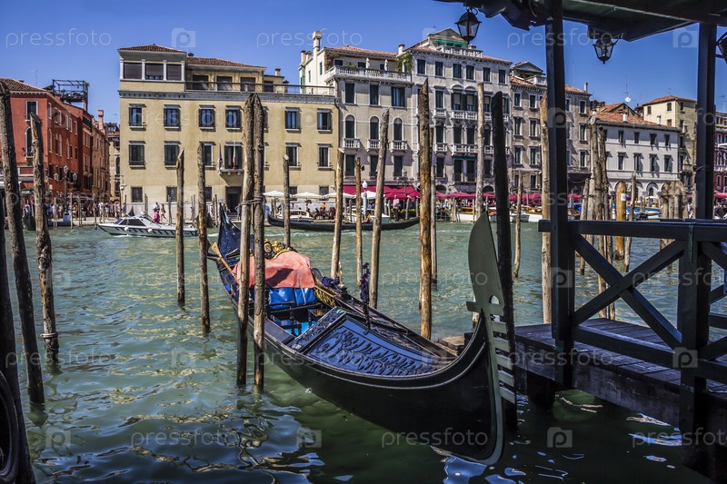 Гранд-канал в один из летних дней, швартовка гондол у причалов, Венеция, Италия