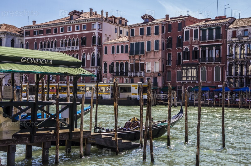 Гранд-канал в один из летних дней, швартовка гондол у причалов, Венеция, Италия