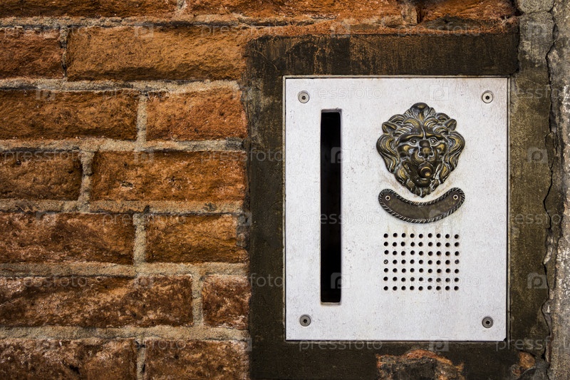 Латунная дверная табличка и дверной звонок в форме головы льва на старой треснутой кирпичной стене, Венеция, Италия