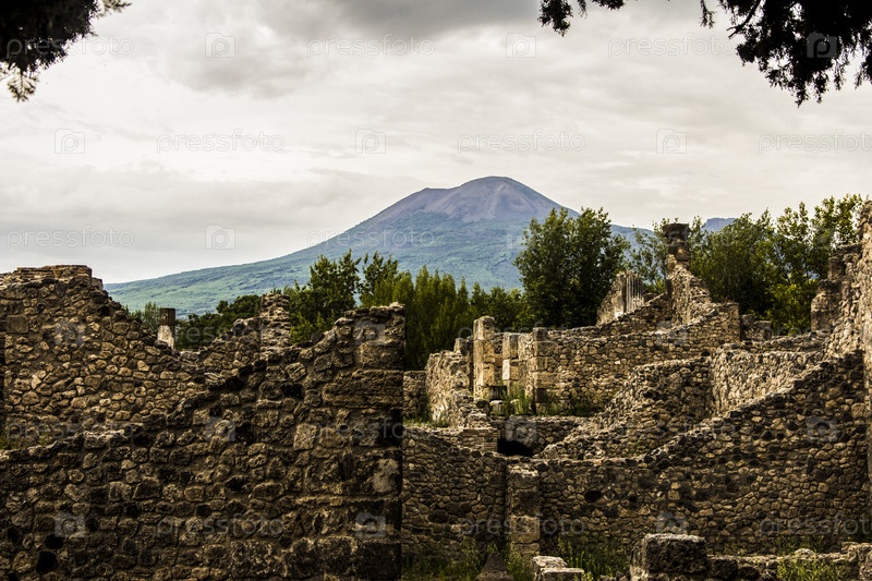 Город Помпеи, разрушенный в 79 г. до н.э. в результате извержения вулкана Везувий. Античные руины и вулкан недалеко от Неаполя, Италия