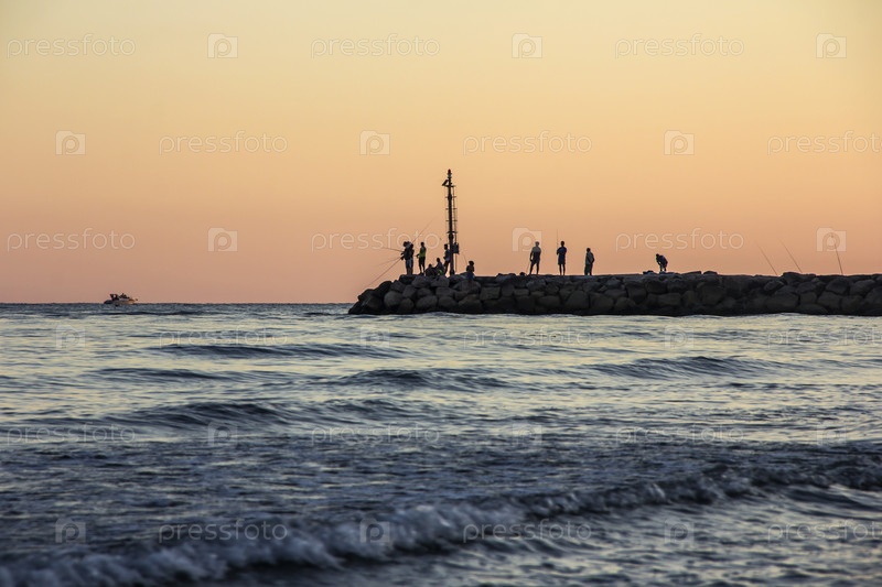 Закат на Тирренском море, вид на волнолом, силуэты рыбаков, гавань и побережье Террачины, Лацио, Италия