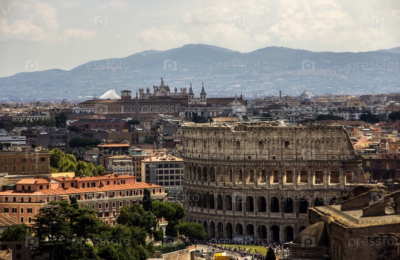 Обзор Рима с памятником и несколькими улицами, крышами, куполами, Колизеем, имперским форумом, Римом, Италией