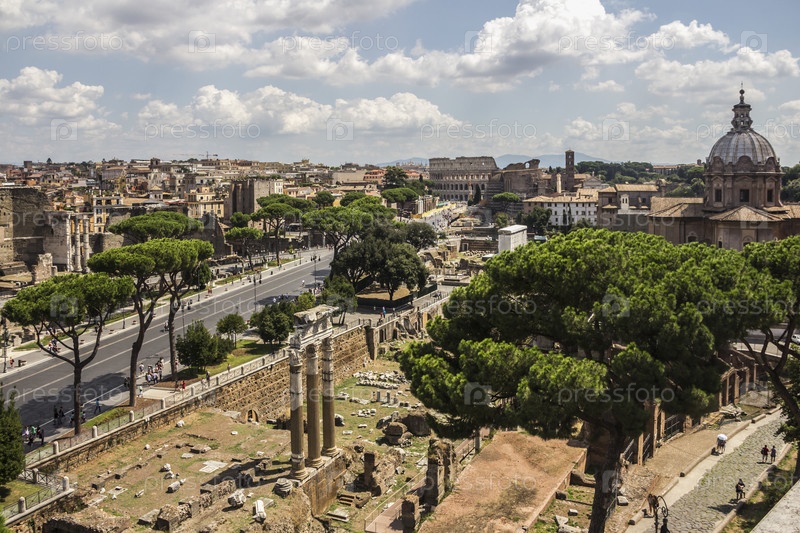 Обзор Рима с памятником и несколькими улицами, крышами, куполами, Колизеем, имперским форумом, Римом, Италией
