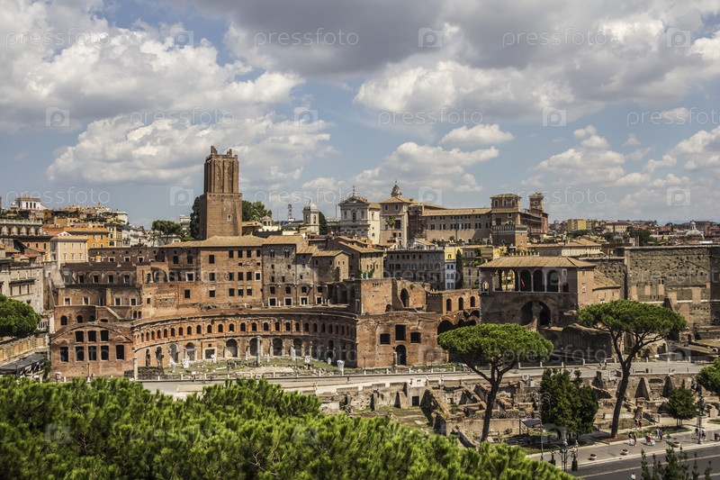 Обзор Рима с памятником и несколькими улицами, крышами, куполами, Колизеем, имперским форумом, Римом, Италией
