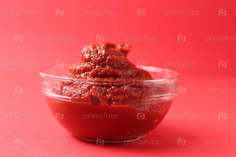 Томатная паста в стеклянной миске для соуса на красном фоне моноколора. Пищевой соус из красных помидоров