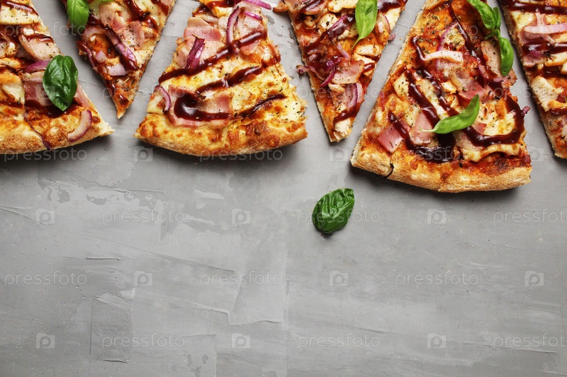 Пицца на сером фоне с темным кисло-сладким соусом и базиликом. с пространством для текста copyspace. быстрое питание